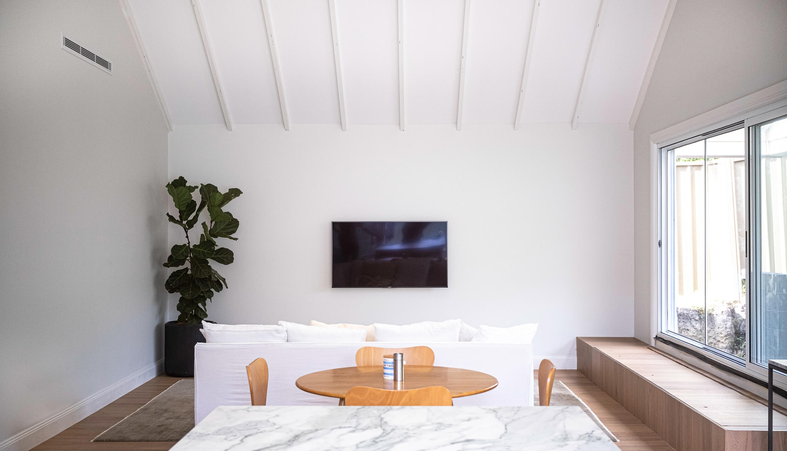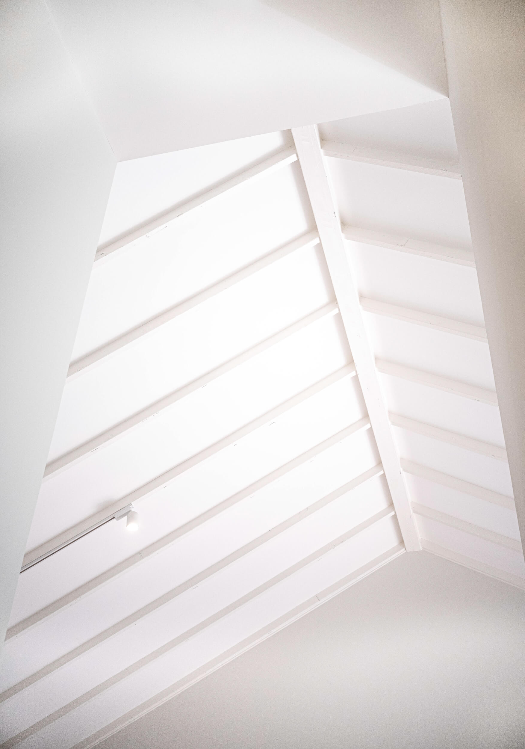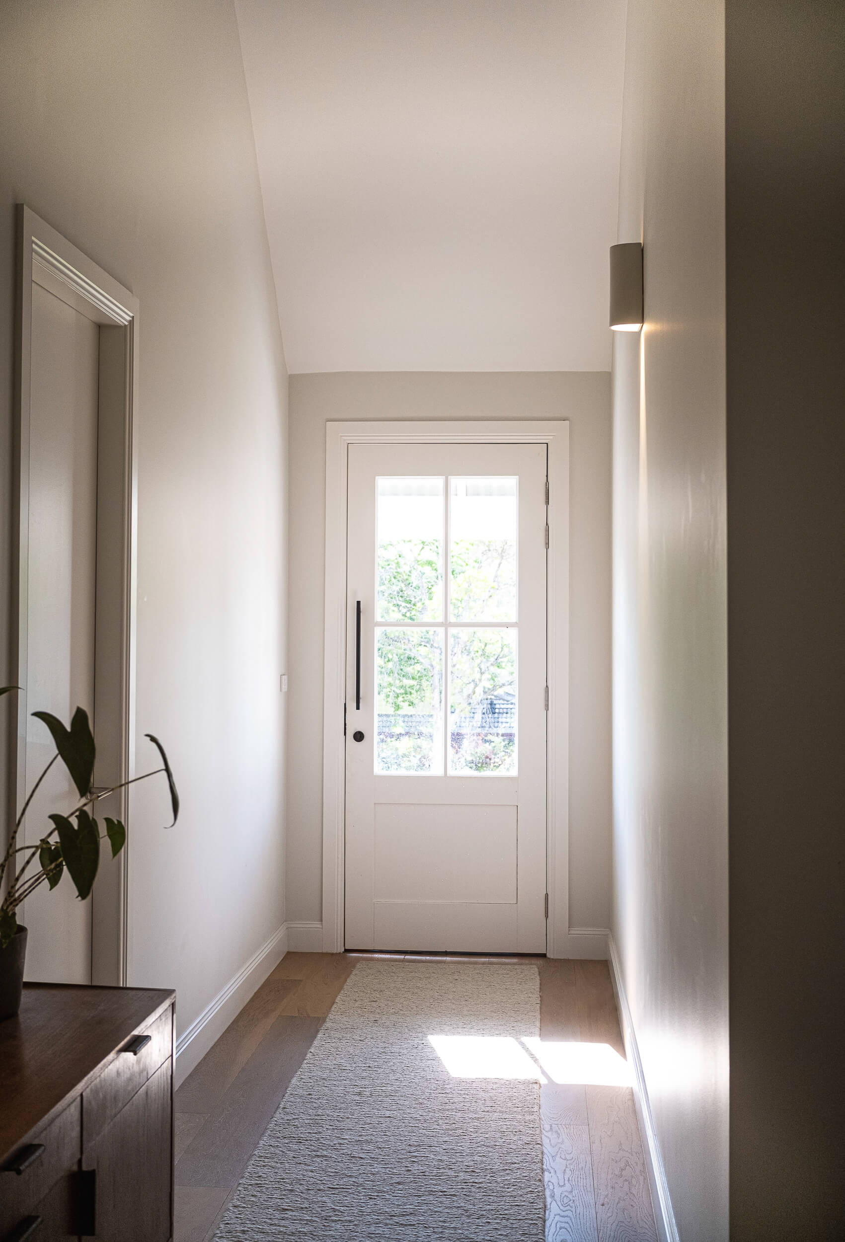 The bedrooms and bathrooms are all at the front of the home, connected by the epic hallway that leads you down to the living space with its beautiful cathedral ceiling. This ceiling was engineered on site by Brendan pulling from his experience with framing and creating beautiful spaces. The end result creates a beautiful moment as you enter through the front door and look straight down to the living.